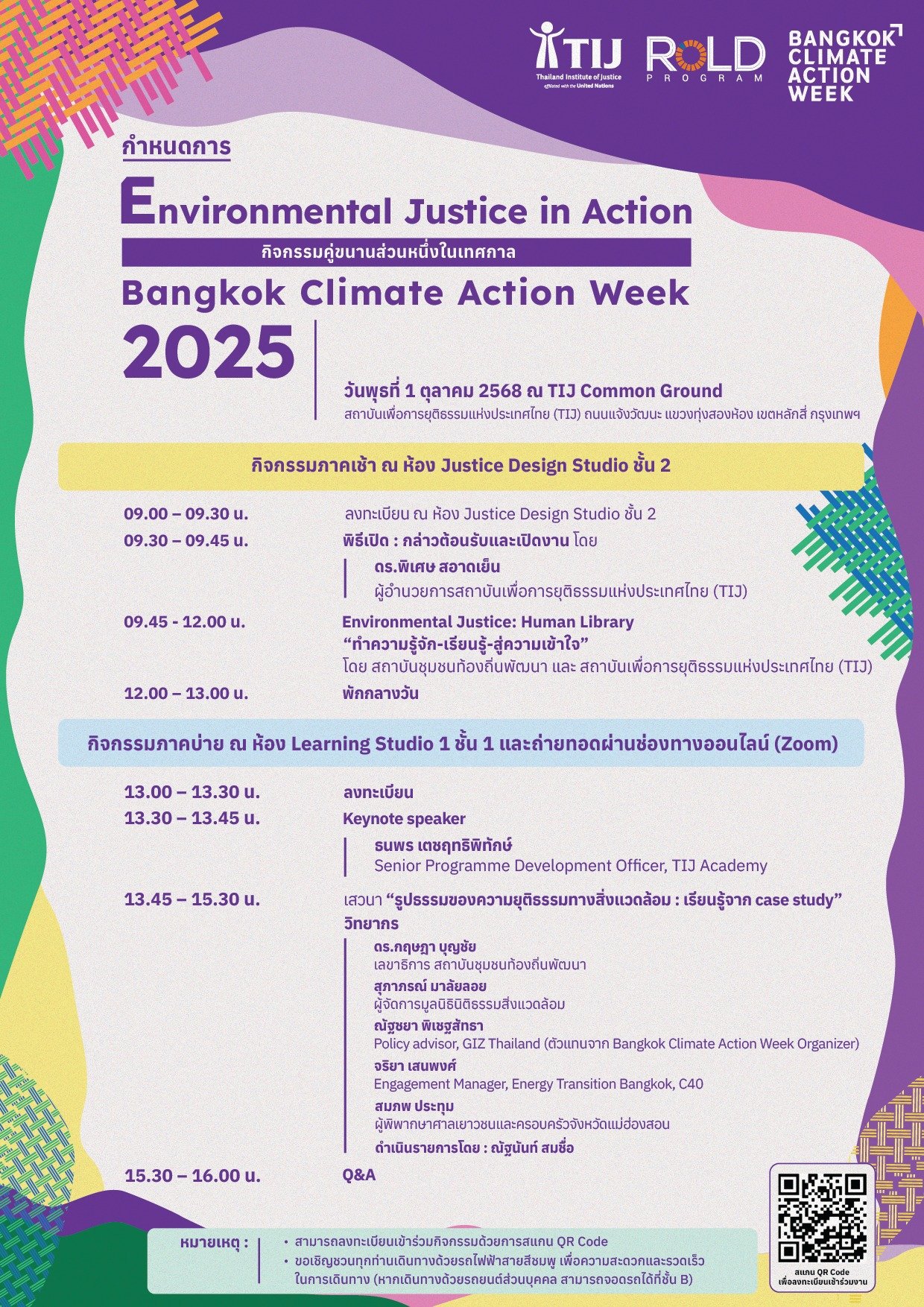 13.00–16.00 น. เปิดเวทีเสวนา หัวข้อ "รูปธรรมของความยุติธรรมทางสิ่งแวดล้อม : เรียนรู้จาก Case Study" นำเสนอกรณีศึกษาที่สะท้อนการบูรณาการหลักการ Environmental Justice เข้าสู่กฎหมาย นโยบาย และโครงการด้านสังคม ในรูปแบบ Hybrid ผู้สนใจสามารถร่วมรับฟังผ่านทาง Zoom ได้ที่