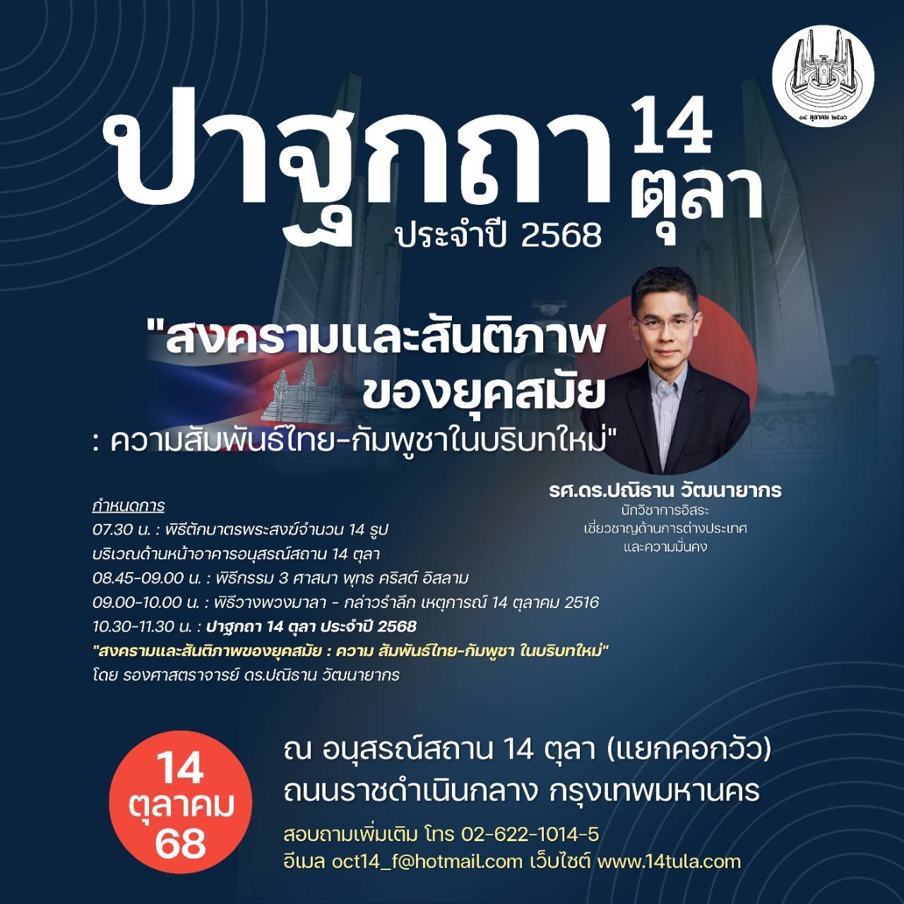 มูลนิธิ 14 ตุลา ขอเชิญประชาชนทุกภาคส่วนเข้าร่วม งานรำลึก 14 ตุลา ประจำปี 2568 เพื่อร่วมรำลึกถึงเหตุการณ์ 14 ตุลาคม 2516 และแลกเปลี่ยนมุมมองทางวิชาการในหัวข้อสำคัญร่วมสมัย