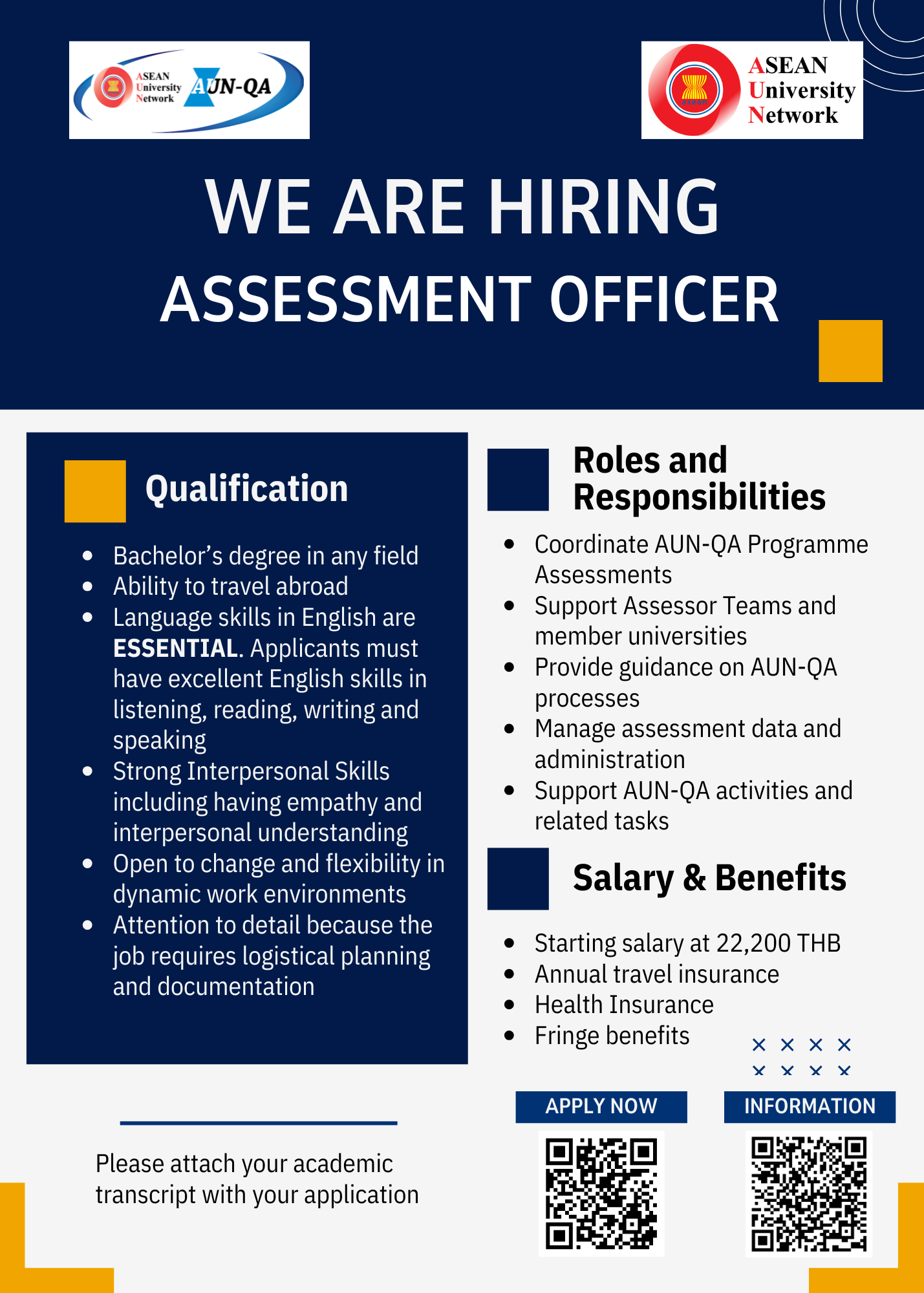 We are looking for suitable candidates (Bachelor graduate - Thai Nationality Only) to take up a full-time job as an AUN-QA Assessment Officer.