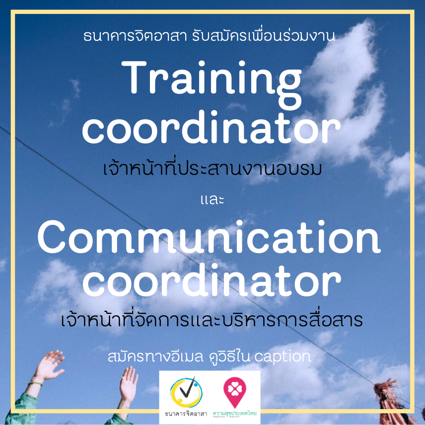 โครงการวิถีพัฒนาจิต ในการสนับสนุนของ สสส. ดำเนินงานสร้างเสริมสุขภาวะทางปัญญา (spiritual health promotion) ผ่านกลไกและช่องทางต่างๆ อาทิ ความสุขประเทศไทย ธนาคารจิตอาสา งานฟังสร้างสุข ฯลฯ เปิดรับสมัครเจ้าหน้าประสานงานอบรม (training coordinator) และเจ้าหน้าที่จัดการและบริหารการสื่อสาร (communication coordinator)