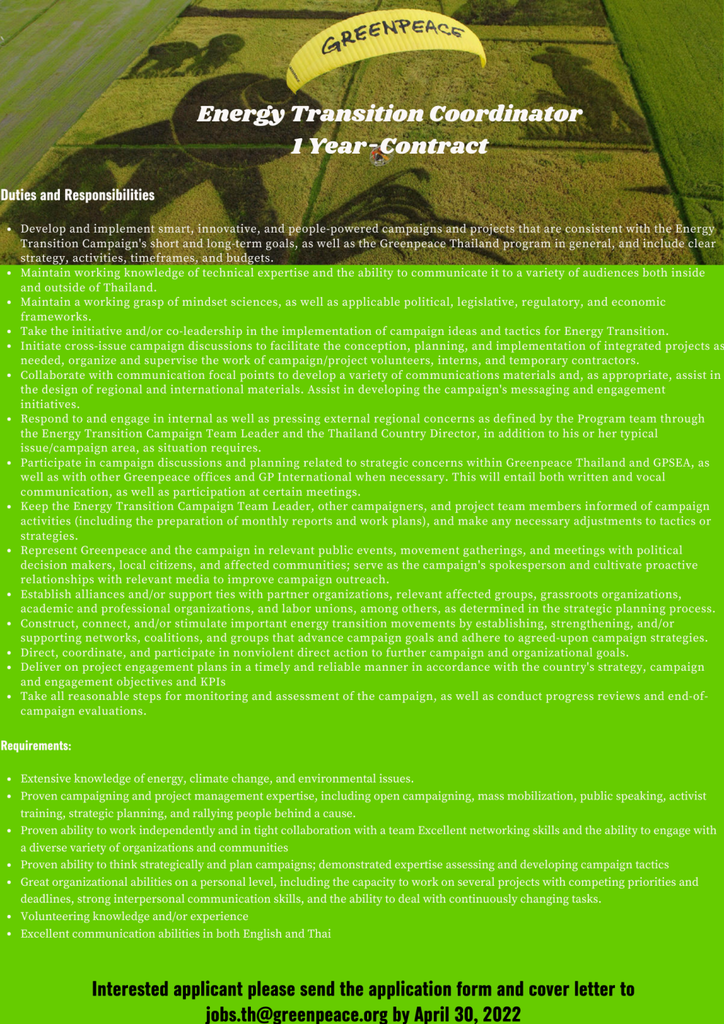 Interested candidates are invited to write Letter of Introduction, explaining why you are qualified for the position and why you want to work for Greenpeace, fill-up the attached Application Form and email to: jobs.th@greenpeace.org