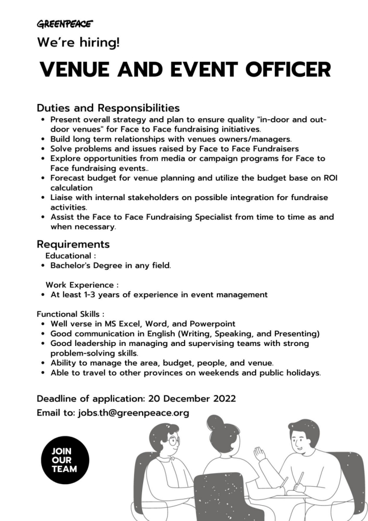 Interested candidates are invited to write Letter of Introduction, explaining why you are qualified for the position and why you want to work for Greenpeace, fill-up the attached Application Form and email to: jobs.th@greenpeace.org
